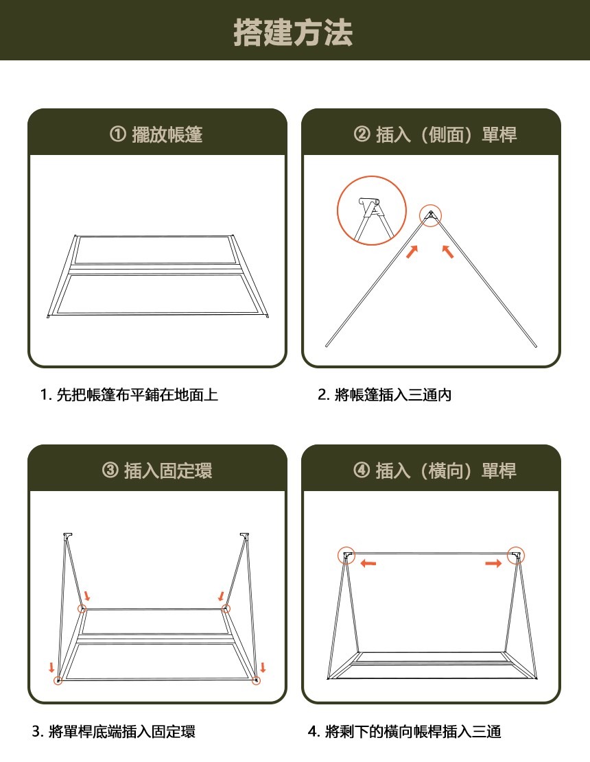 2. 在搭建時,不要使用過大的力氣去固定,會導致帳篷的損壞