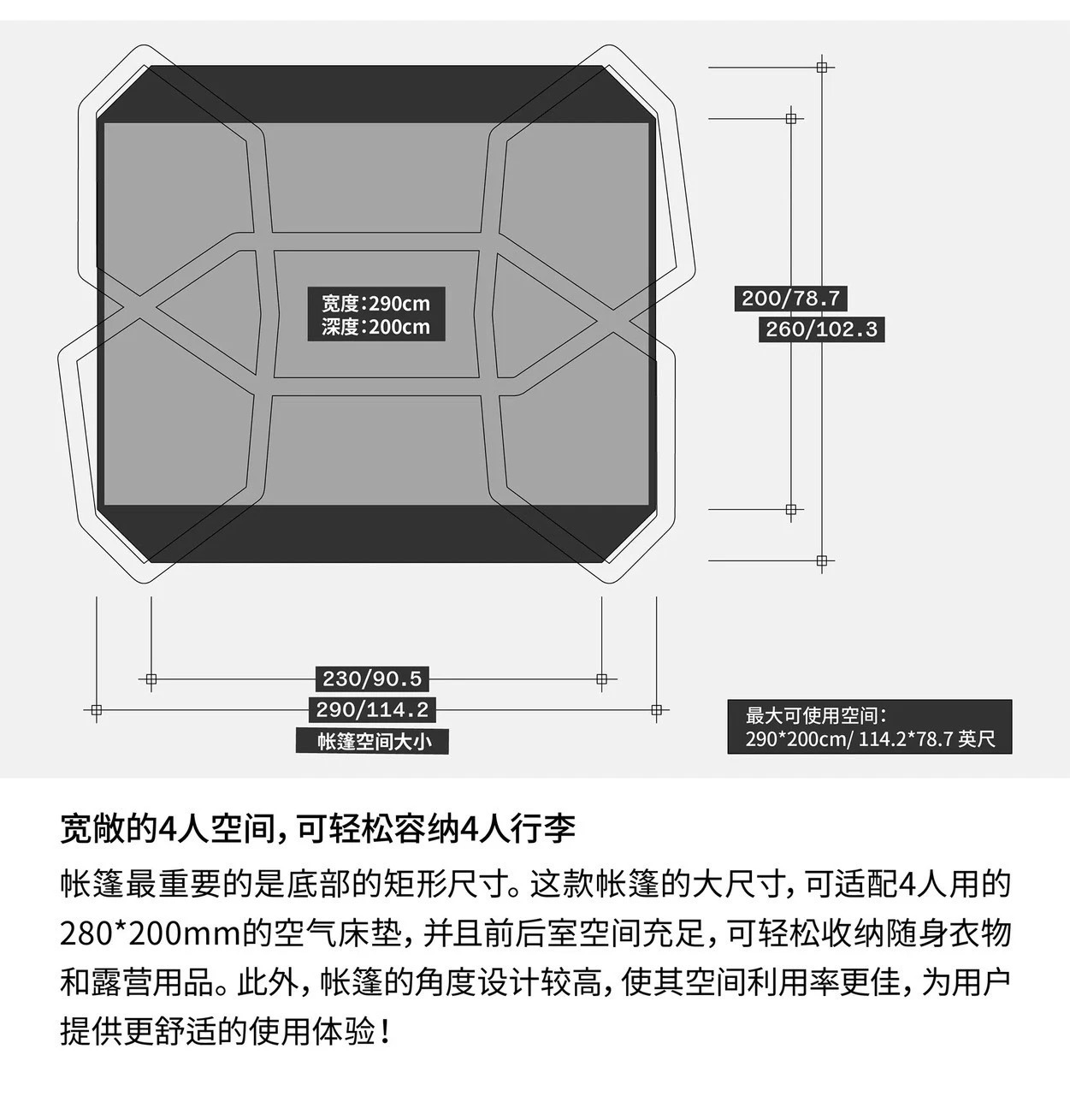 商品規格: 🌀 AIR BEAM 氣柱系統 英文規格 中文說明 One Pump System 單一氣閥注氣系統 Multi-Chamber System 多氣室結構 Depression Valve 自動洩壓閥 HDPE Ripstop Reinforce 高密度抗撕裂氣柱補強 尺寸:290 x 260 x 高165 cm 本體:14.85 公斤,整體含配件共 17.5 公斤,手動氣泵重 1.2 公斤 內帳:210g TC棉(65%聚酯 / 35%棉) 外帳:75D 聚酯牛津布 底部:210D 聚酯牛津布+PU塗層 窗戶:TPU+聚酯魔鬼氈 電源孔:20D 抗撕裂聚酯 本體帳篷+外帳+後側TPU窗+地墊